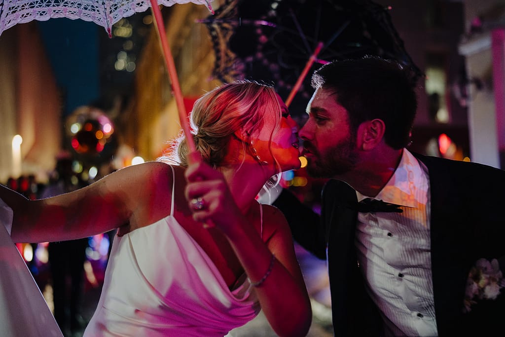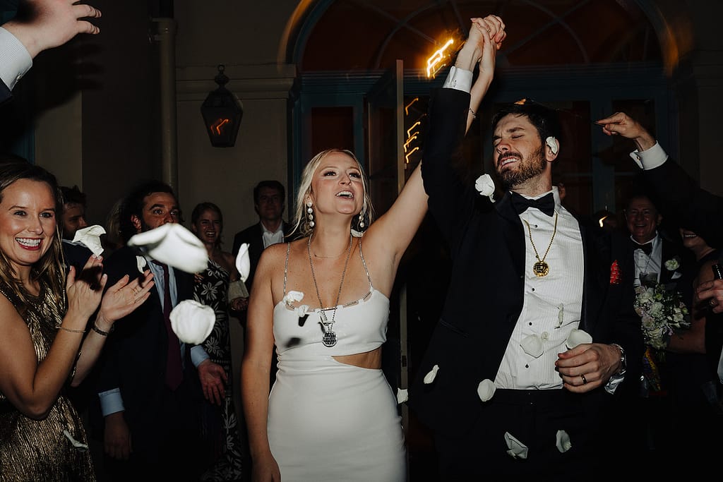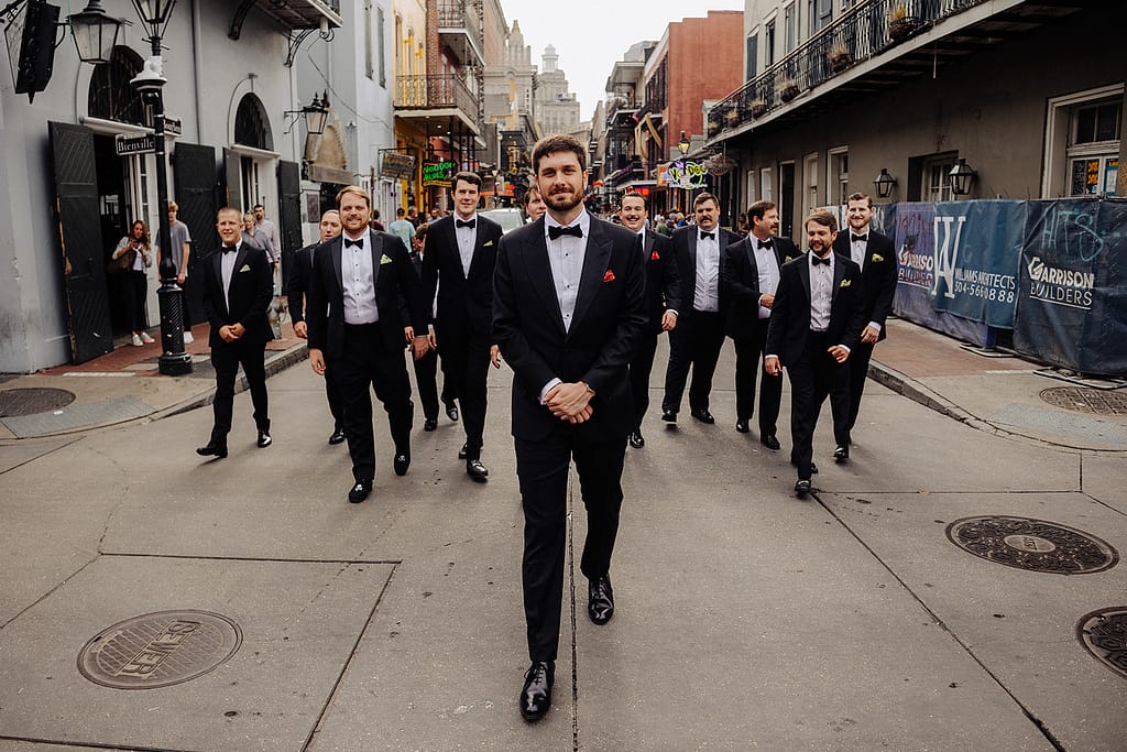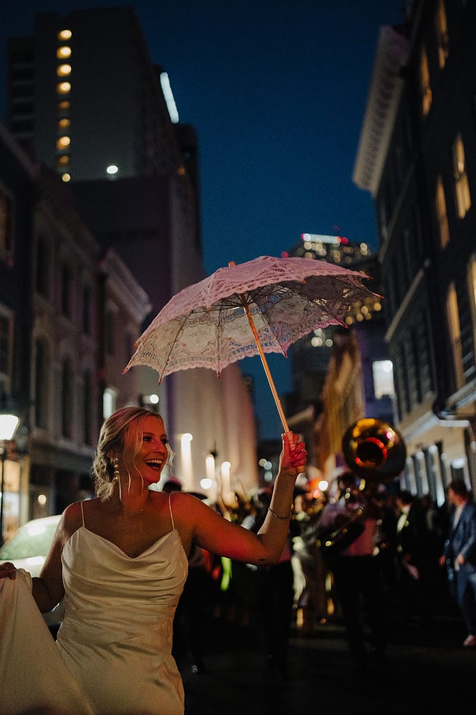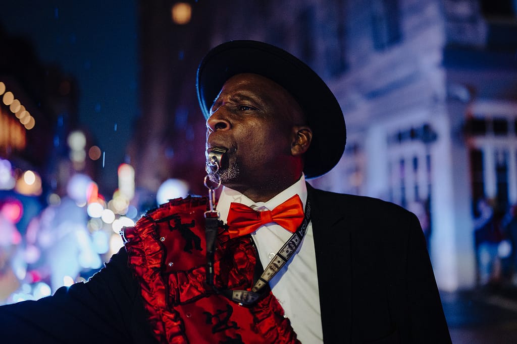 Puis l’énergie change. Après la cérémonie, la fête déborde dans la rue avec une second line qui traverse le French Quarter. Les cuivres, les tambours, le mouvement, la joie collective : tout devient plus vivant, plus spontané, plus imprévisible — parfait pour un reportage naturel.
